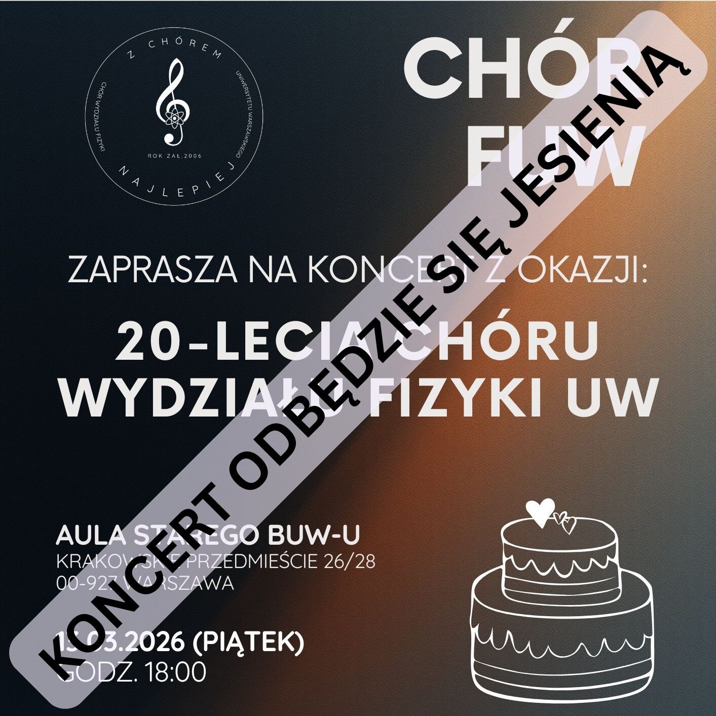 AKTUALIZACJA (5.03.2026): Z przyczyn niezależnych od nas jesteśmy zmuszeni przenieść termin koncertu na jesień tego roku. Więcej informacji wkrótce. Z okazji 20-lecia działalności Chór Wydziału Fizyki UW zaprasza na wyjątkowy Read more about 20-lecie Chóru FUW[…]