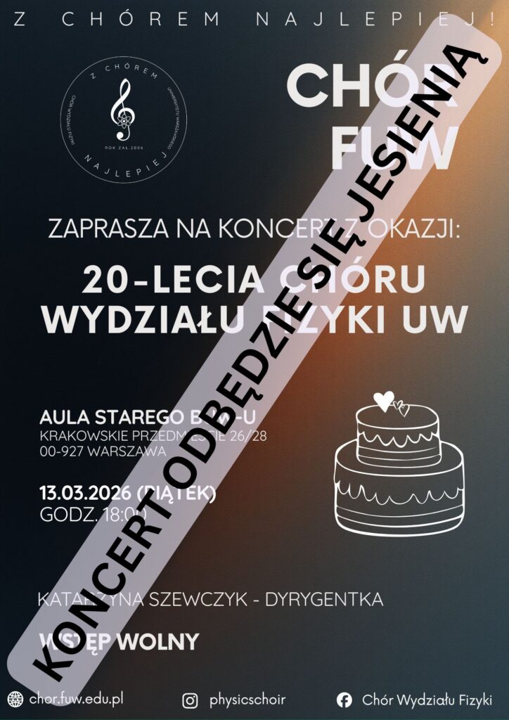 Z okazji 20-lecia działalności Chór Wydziału Fizyki UW zaprasza na wyjątkowy koncert jubileuszowy, który odbędzie się w Auli Starego BUW-u na Krakowskim Przedmieściu. Podczas koncertu usłyszeć będzie można program odzwierciedlający różnorodne zainteresowania muzyczne zespołu — w repertuarze znajdą się utwory m.in. Karla Jenkinsa, Johna Ruttera, Ralpha Vaughana Williamsa, Romualda Twardowskiego i innych.